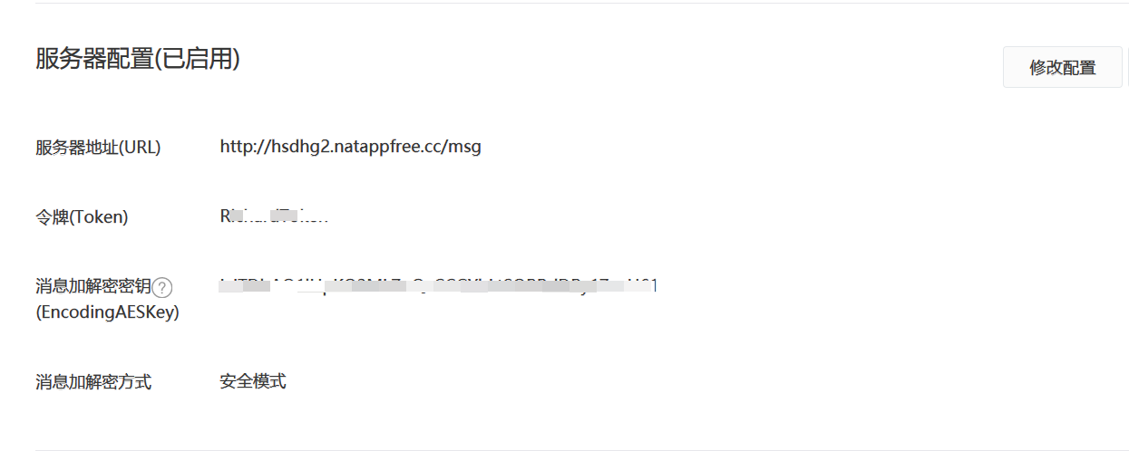- 注册完成后,进入开发的基本配置,在服务器配置项中,填入natapp软件生成的URL,并且起一个Token,随机生成一个EncodingAESKey,并且消息加解密方式以安全模式实现